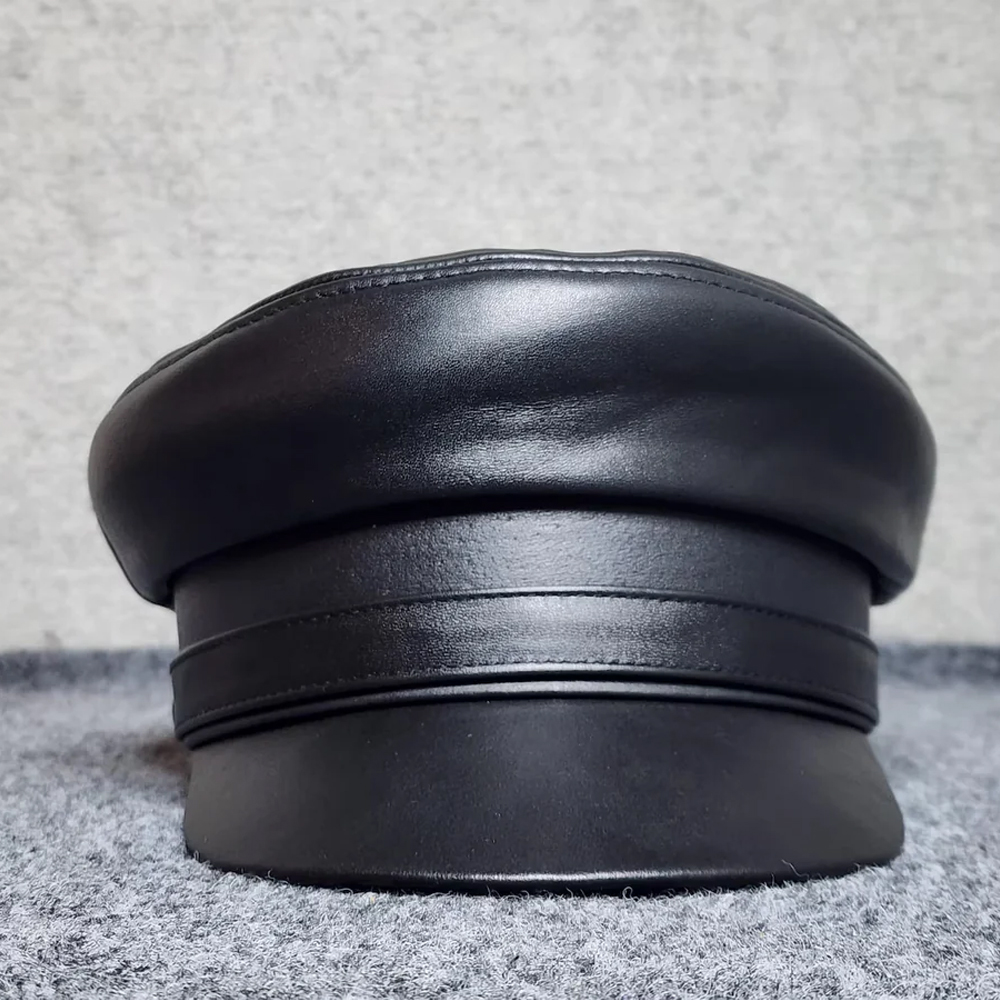Elevate your look with this Biker Cosplay Leather Police Style Cap, a premium black Muir peaked hat that combines vintage officer authority with modern biker and cosplay appeal. Crafted from genuine leather, this cap features a structured crown and firm peaked visor for a bold, commanding silhouette that works perfectly for costume wear, fashion statements, and collectible headwear.