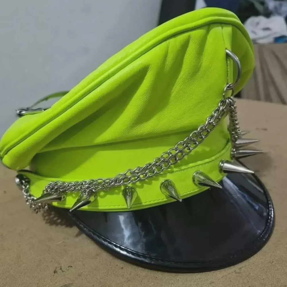 Inspired by authentic Army Muir and biker cap silhouettes, this piece features a sharply structured crown and firm peak, creating a clean, authoritative profile. The vivid neon tone modernizes the iconic design, making it ideal for pride celebrations, festivals, leather events, cosplay, motorcycle wear, and alternative street fashion.