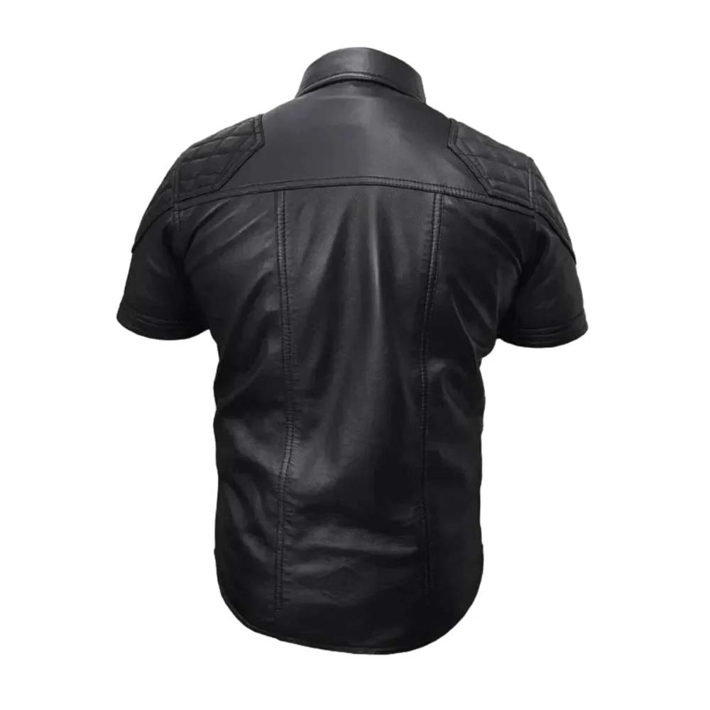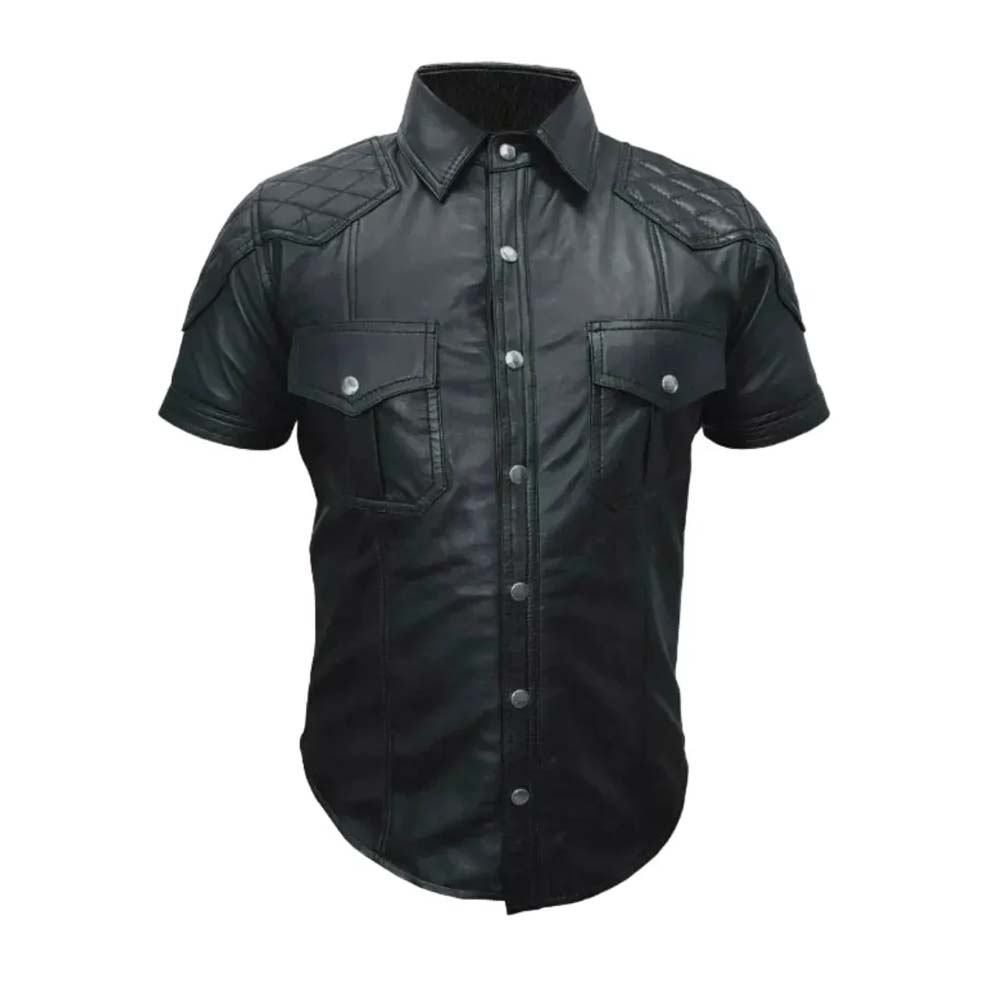 Design: Uniform-inspired leather shirt with a bold, masculine aesthetic