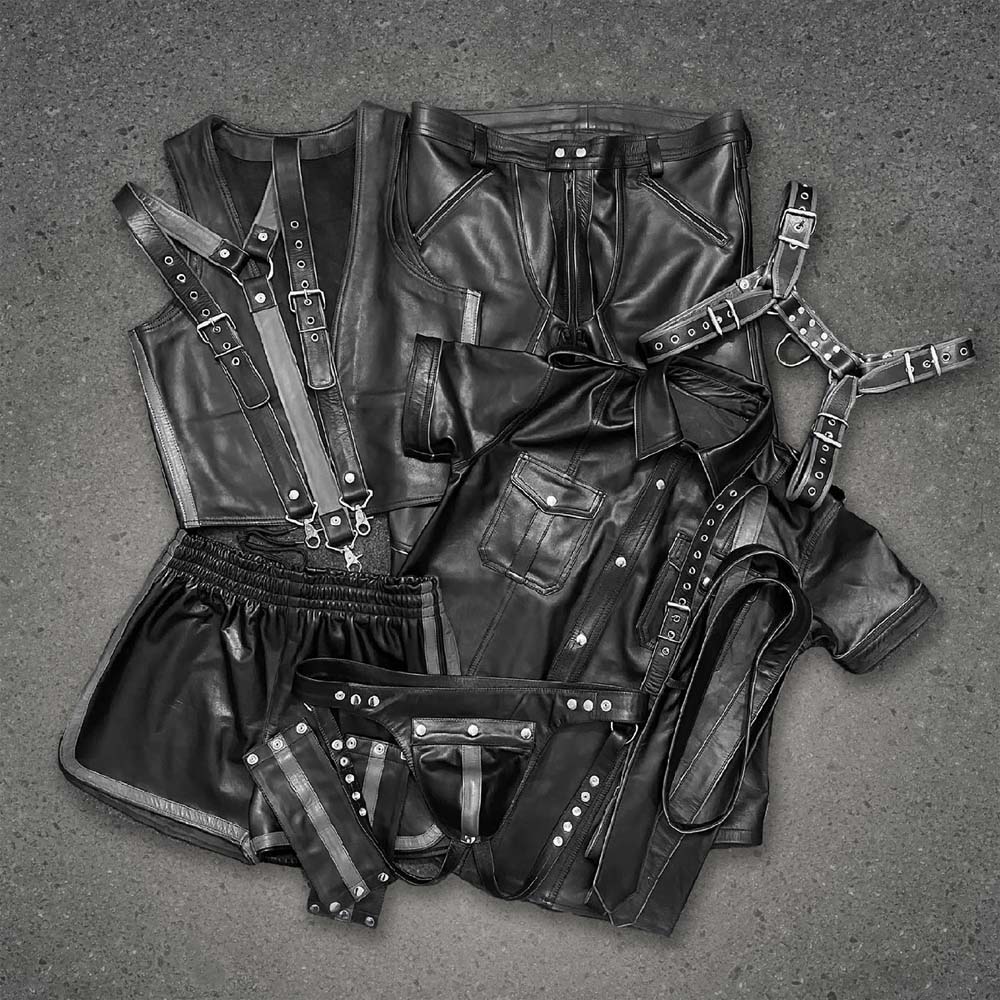 Command attention with the complete The Legend German Shop leather ensemble — a bold 9-piece statement set designed for confidence, structure, and undeniable presence. Crafted from premium-quality leather and detailed with durable metal hardware, this coordinated outfit blends edgy fashion with refined construction.