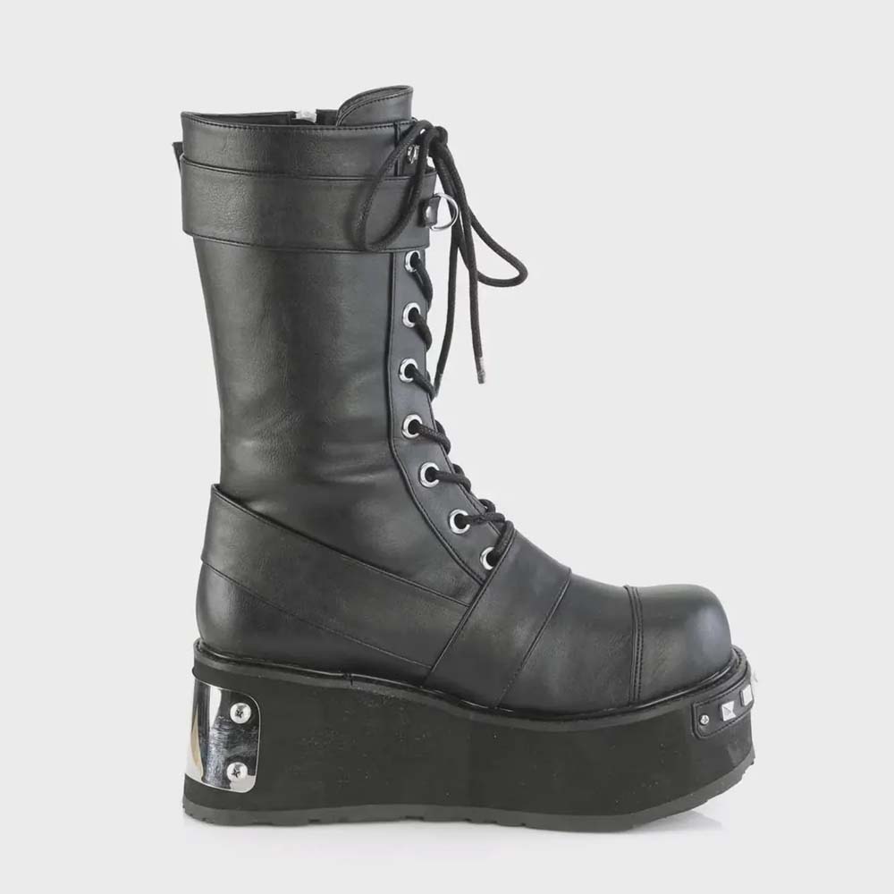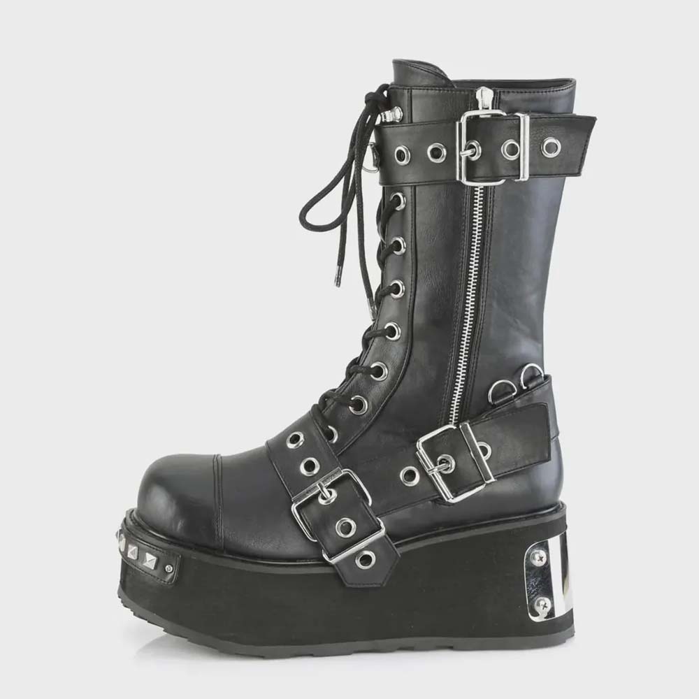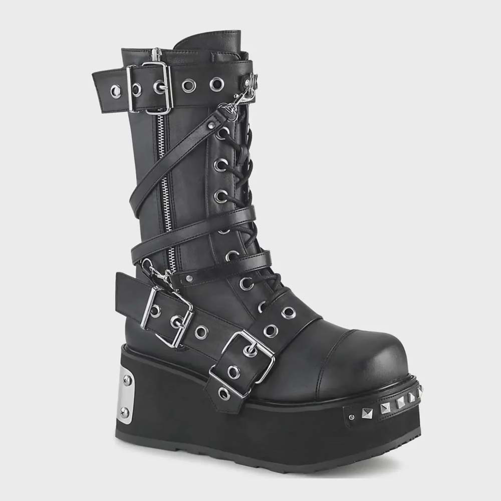 Crafted with attention to detail, these boots feature a dramatic 3¼-inch (8.3 cm) platform, wrap-around buckle straps, and a lace-up front for a secure fit. An outside zipper closure allows for easy wear, while studded accents and a polished platform heel ensure you command attention wherever you go.